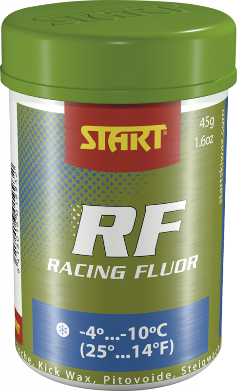 -4°...-10°C (25°...14°F)New Start Racing Fluor line is a fluorinated kick wax line. Suitable for use as kick wax alone, or as a finishing wax applied on top of kick waxing.