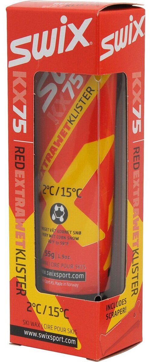 Temperature range +2°C to +15°C (36°F to 59°F). Wet snow klister. Used when the snow has a high water content such as slush, and the air temperature is well above freezing. Late spring klister. Scraper included.