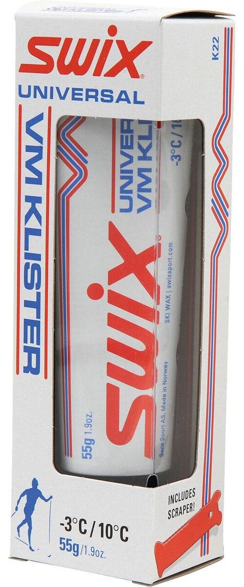 Temperature range +10°C to -3°C (50°F to 27°F). For coarse, granular snow changing from wet to crust. A very popular and “flexible” klister. Improved flexibility toward fine-grained moist snow, without icing up. Improved grip on wet, coarse-grained snow. Improved “feeling”. To be applied as the final layer of klister. Comparable to the old, famous VM-klister from 1982. Frequently used in World Cup competition. Scraper included.